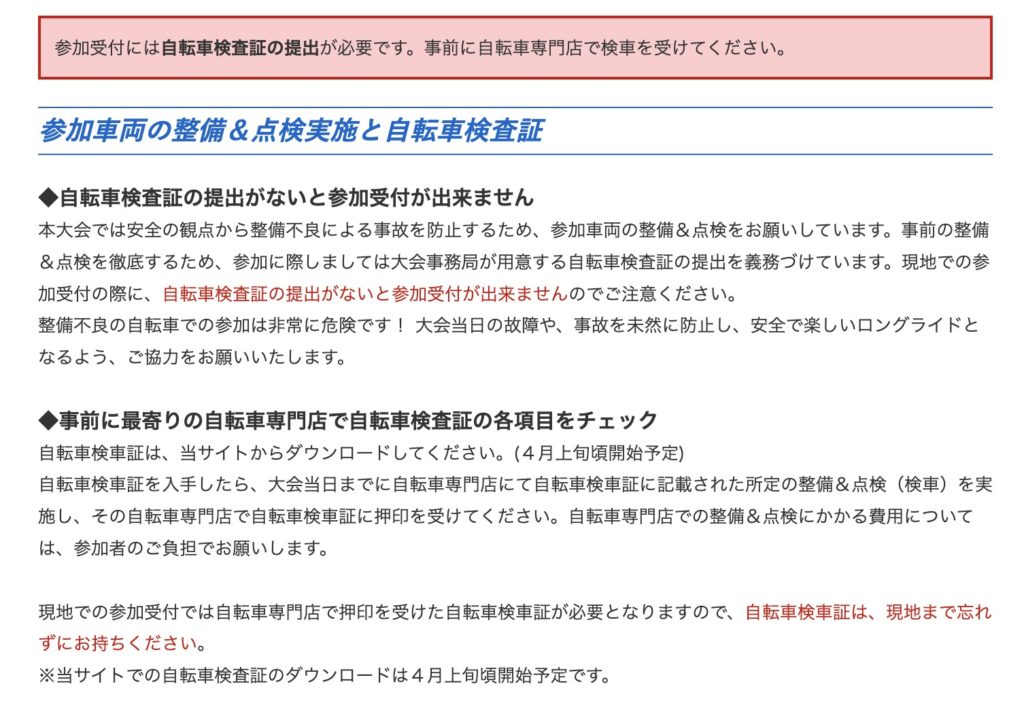 イベント参加には自転車検査証が必要です。