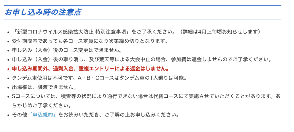 ほか注意点として申込後の取り消し及び荒天による大会中止の場合でも参加費の返金はありません。