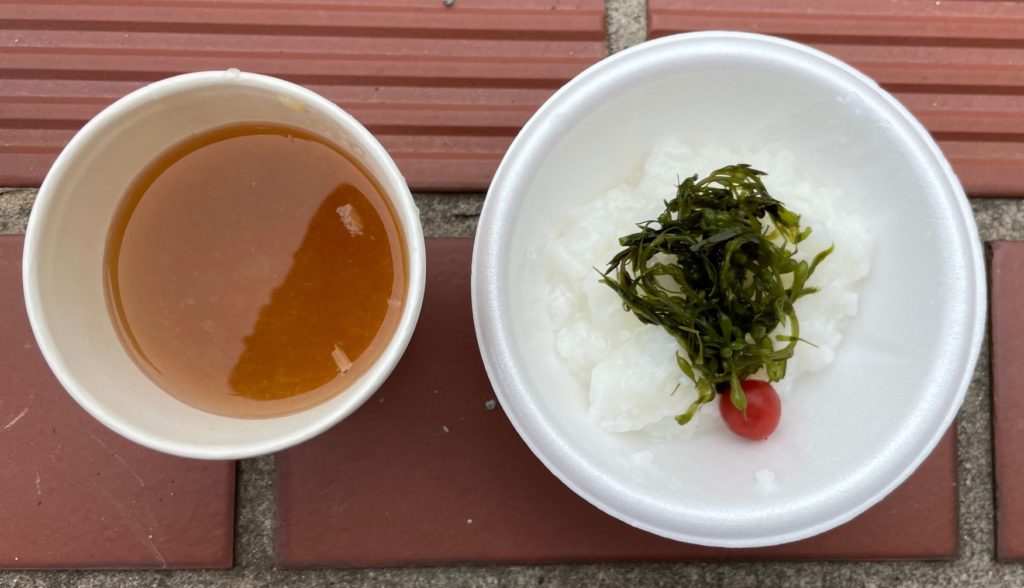 スタートから19km地点で相川ASに到着。ここではミニカップ蕎麦、おかゆ、オニオンスープがおかわり自由で召し上がれます。内臓に優しい朝食のような補給食で嬉しかったです。