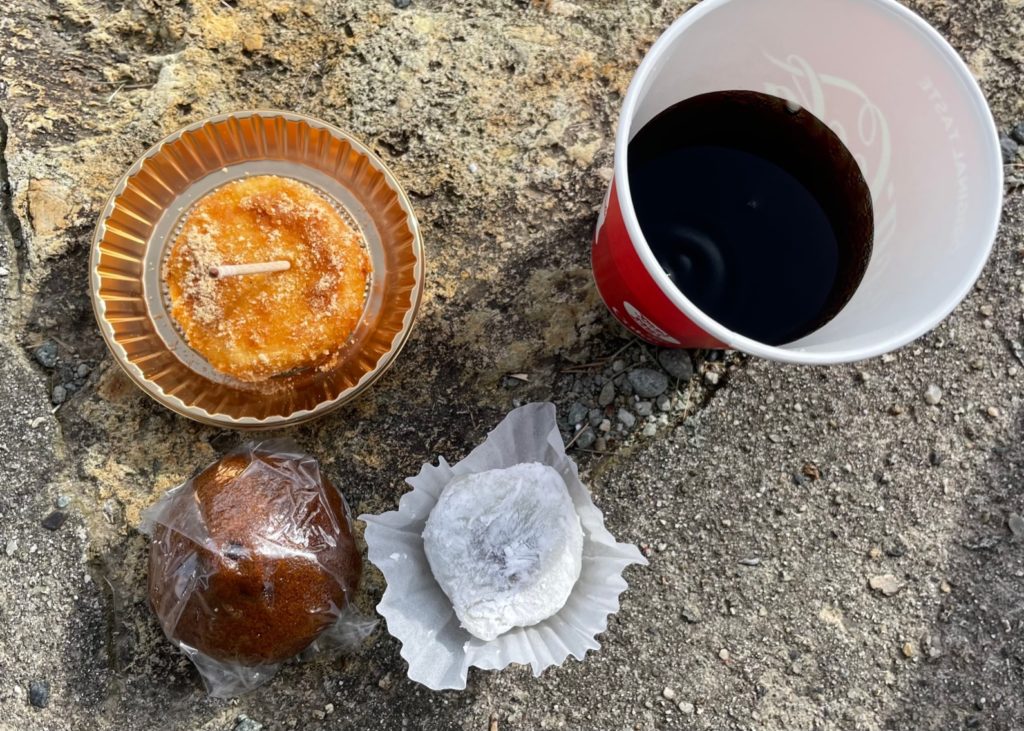 ここでは和菓子がメイン。数ある中から、きな粉餅、豆餅、お饅頭をチョイス。飲み物はコーラを頂きました。