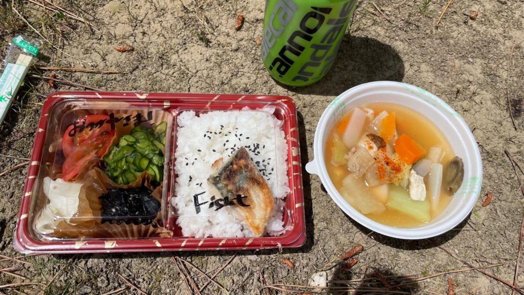 確か・・・イカメンチカツ、肉メンチカツ、煮物弁当、サバ竜田揚げ弁当、あと1点は忘れましたが、私はこの中からサバ竜田揚げ弁当を頂きました。お弁当と豚汁が空腹を幸福に満たしてくれます。