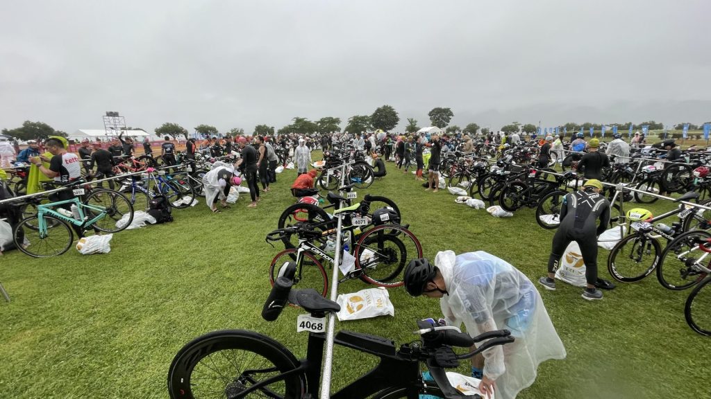 防寒対策といい、ウェットスーツといい、対策が甘く舐めてたと反省したものの、この状況をどう乗り切る?と自問し、スイムは後ろからゆっくりスタート、人混みのインコースには近づかないと決めた。